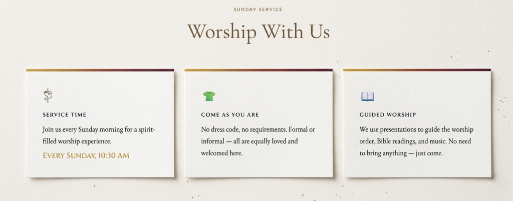 - Worship Format: We use PowerPoint presentations to guide worship order, Bible readings, and music. No need to bring a Bible or hymn book—just come and experience God’s love and the presence of the Holy Spirit.