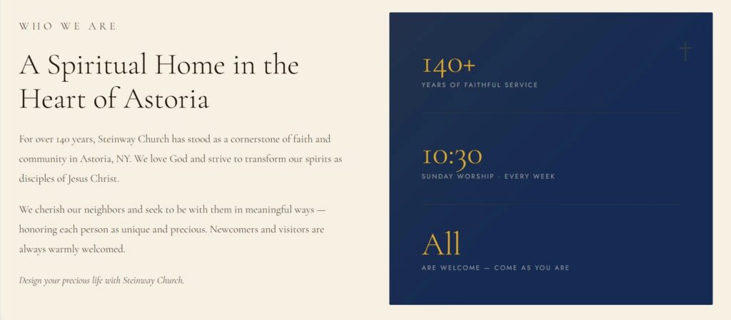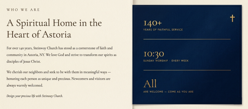 For over 140 years, Steinway Church has been a spiritual home for our local community in Astoria, NY. We love God and strive to transform our spirits as disciples of Jesus Christ. We cherish our neighbors and seek to be with them in meaningful ways.