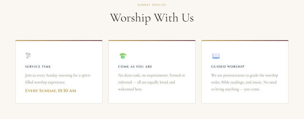 - Sunday Service: Every Sunday at 10:30 a.m.